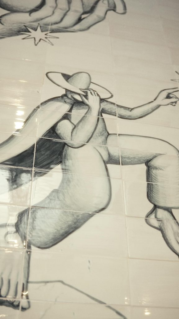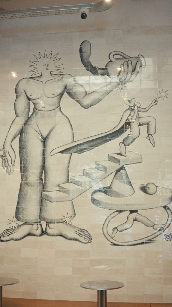 Це не просто декоративний елемент, а повноцінний мурал, перенесений у формат кераміки: робота зберігає масштабність настінного живопису, але водночас має матеріальність і фактуру плитки.